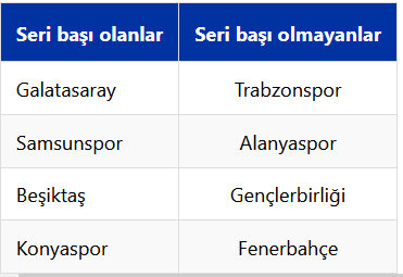Gruplarını ilk sırada bitiren Galatasaray, Samsunspor ve Beşiktaş ile en iyi grup ikincisi Konyaspor, çeyrek finalde seri başı olma hakkı elde etti. Çeyrek final, tek maç eleme usulüne göre seri başı takımların sahasında oynanacak. Grup aşamasında birbirleriyle karşılaşan ekipler, çeyrek finalde eşleşemeyecek.